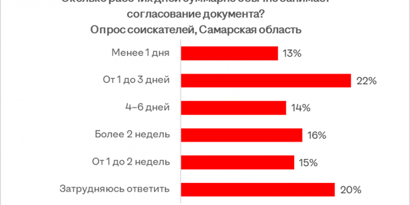 По данным опроса hh.ru, 22% соискателей из Самарской области в среднем тратят от 1 до 3 дней на согласование различных документов на работе. У 14% респондентов этот процесс занимает 4-6 дней, у 15% - от 1 до 2 недель, а у 16% - более 2 недель. Лишь 13% опрошенных согласуют документы в течение своего рабочего дня.
