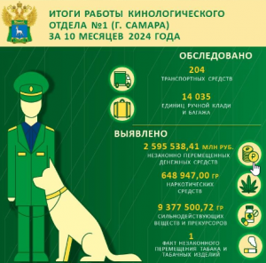 За 10 месяцев 2024 года кинологи Самарской таможни выявили более 100 фактов незаконного перемещения через границу сильнодействующих веществ, наркотических средств, табачных изделий и валюты.