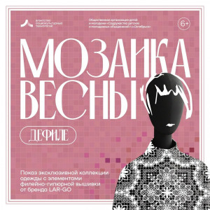 17:00 – Мозаика весны. Дефиле, показ эксклюзивной коллекции одежды с элементами филейно-гипюрной вышивки от бренда LAR- GO. Автор коллекции, дизайнер – Лариса Сомова. Постановка – Мария Казак.