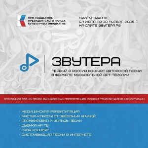 С 1 июля по 30 ноября 2025 года идет прием заявок на участие в конкурсе для авторов и исполнителей песен «Звутера». Цель проекта – создать творческое пространство для самовыражения, психологической разгрузки и интеграции в общество через музыку. Участники смогут не только проявить свои таланты, но и получить профессиональную поддержку от экспертов в области психотерапии, звукозаписи, исполнительского и продюсерского мастерства.