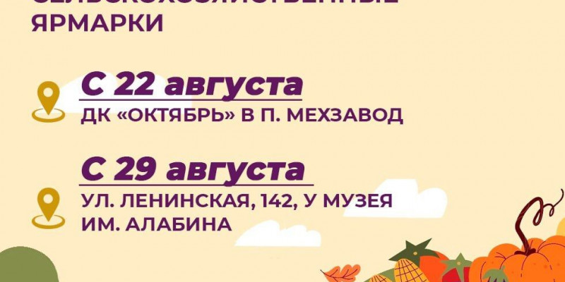 Сезонная сельскохозяйственная ярмарка около ДК «Октябрь в поселке Мехзавод откроется, как и было заявлено ранее, 22 августа. Работать она будет с пятницы по воскресенье с 9:00.