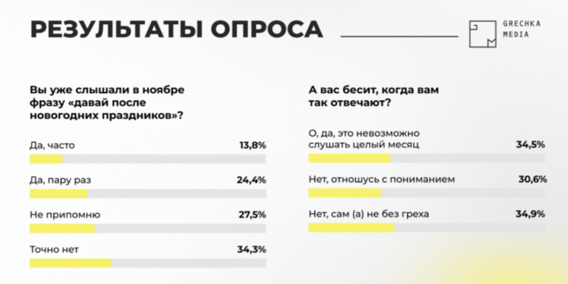 В конце ноября почти 40% россиян рассказали, что уже услышали фразу: «давай после новогодних праздников». При этом более трети признались, что их бесит, когда люди откладывают дела подобным образом. А каждый десятый уже был бы готов отложить все дела до будущего года. Об этом говорят данные опроса аналитического центра Grechka Media, приуроченного к приближающимся праздникам.