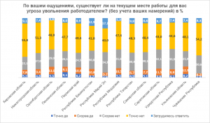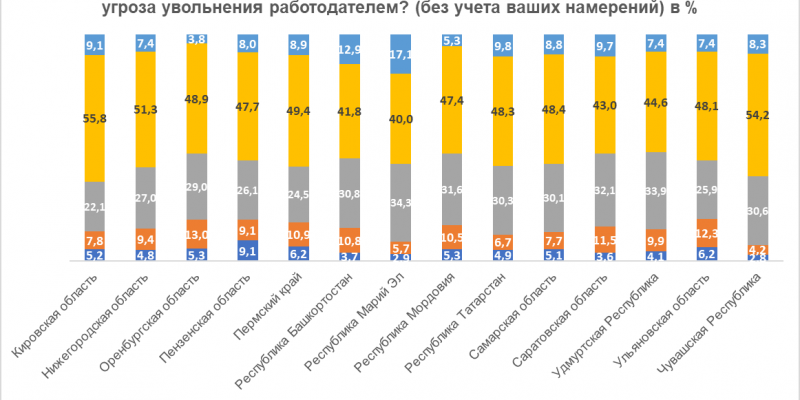 В разрезе регионов ПФО больше всего боятся потерять работу («точно да» и «скорее да») жители Ульяновской области - 18,5% респондентов, Оренбургской области – 18,3%, Пензенской области – 18,2%. А однозначно уверенно («точно нет») себя чувствуют чаще всего в Кировской области – 55,8% респондентов, Чувашии – 54,2%, Нижегородской области – 51,3%.