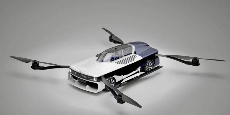 Это гибрид авто и квадрокоптера. Двигатели с воздушными винтами в транспорте размещены на складных поворотных лучах в углах кузова. Работает новинка от электричества, но также возможен и водород.
