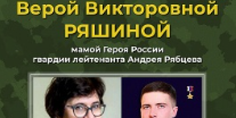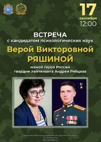 17 августа в 12:00 в Самарской областной универсальной научной библиотеке состоится встреча с московским психологом, кандидатом психологических наук Верой Ряшиной – мамой Героя России Андрея Рябцева. (12+)