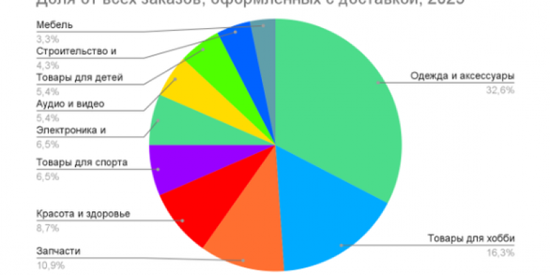 Самая популярная категория, в которой товары заказывают с доставкой — это «Одежда и аксессуары». На нее пришлось 30% всех заказов с доставкой. На втором месте — «Товары для хобби» с долей 15%. Тройку лидеров замыкают «Запчасти» — на них пришлось 10% заказов. Также в топ-5 — «Красота и здоровье» и «Товары для спорта» с долями 8% и 6% соответственно.