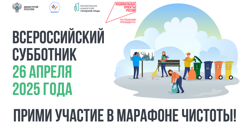Принять участие во Всероссийском субботнике смогут все желающие. В этот день запланирована традиционная уборка дворов и общественных пространств, высадка цветов и деревьев, приведение в порядок скульптур и малых архитектурных форм, покраска лавочек, цоколей, ограждений, уборка в подъездах.В акции, как ожидается, примут участие трудовые коллективы, общественники, владельцы и арендаторы помещений.