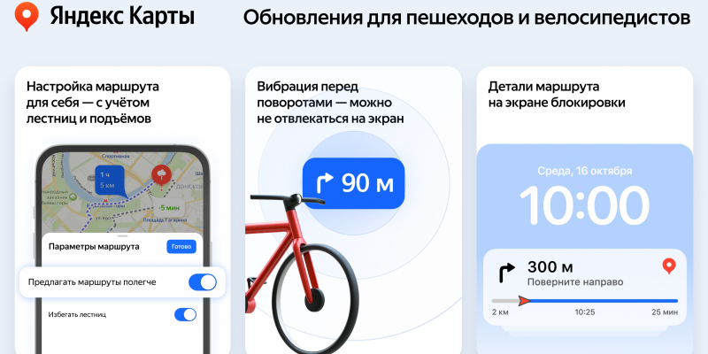 Яндекс Карты обновили навигацию для пешеходов и велосипедистов. Теперь пользователи могут настроить маршрут так, чтобы встретить меньше лестниц и крутых подъёмов. А в пути следить за деталями маршрута даже на заблокированном экране. Обновление поможет пользователям выбирать комфортные для них маршруты и следовать по ним, меньше отвлекаясь на телефон.