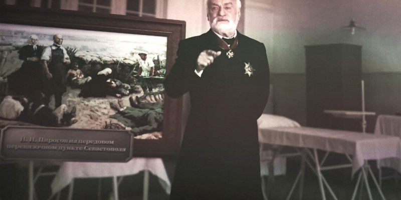 Пётр I сообщает посетителям экспозиции о событиях времени его правления, создатель военной медицины Н.И. Пирогов тепло отзывается о героизме медицинских сестёр во время обороны Севастополя в ходе Крымской войны, а С.М. Прокудин-Горский красочно представляет первые опыты цветной фотографии в России на рубеже XIX и XX веков.