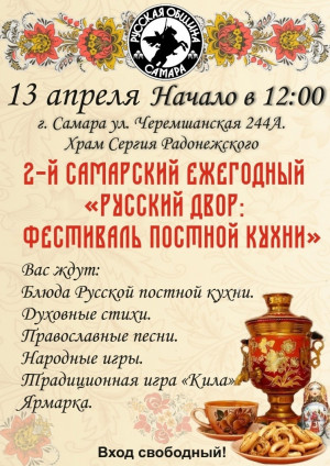 Самарцев приглашают на яркое и вкусное событие – 2-й Самарский Ежегодный "Русский двор: фестиваль постной кухни", который состоится в Вербное Воскресенье, 13 апреля 2025 года, в 12:00. (0+)
