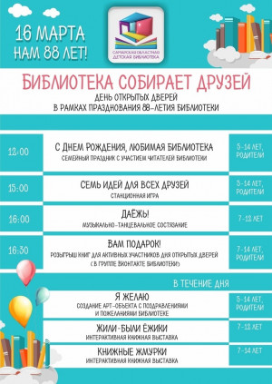 Сегодня Самарская областная детская библиотека отмечает 88-летие! В этот день в библиотеке пройдет день открытых дверей «Библиотека собирает друзей». Подробнее о программе праздника - на странице библиотеки. 5+