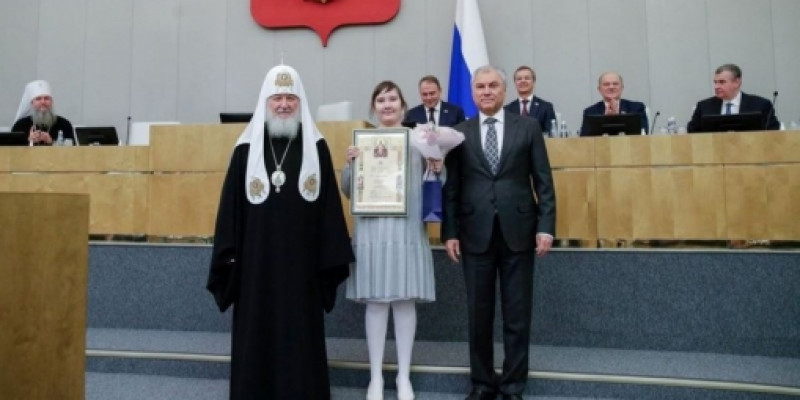 Награду девочке вручали в здании Государственной думы, ее поздравили председатель Госдумы Вячеслав Володин и Патриарх Московский и всея Руси Кирилл.