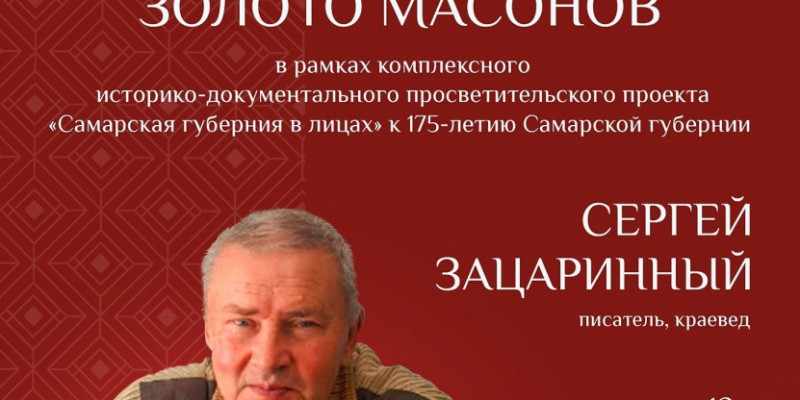 26 февраля в 14:00 в Самарской областной универсальной научной библиотеке пройдёт открытая встреча с писателем Сергеем Зацаринным. Прозаик выступит с презентацией своей новой книги «Неверное золото масонов».