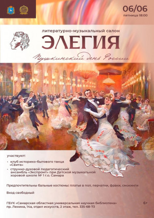 6 июня в 18:00 Самарская областная универсальная научная библиотека приглашает жителей города посетить литературно-музыкальный салон «Элегия». В программе вечера – танцы и музыка времён Александра Сергеевича Пушкина.