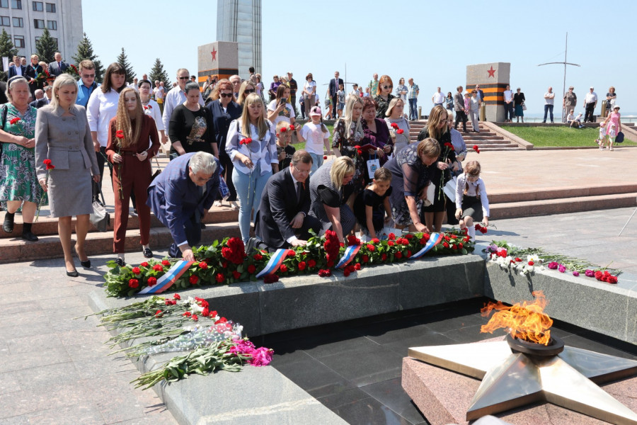 Глава региона возложил цветы к Вечному огню вместе с семьями погибших в ходе спецоперации героев.