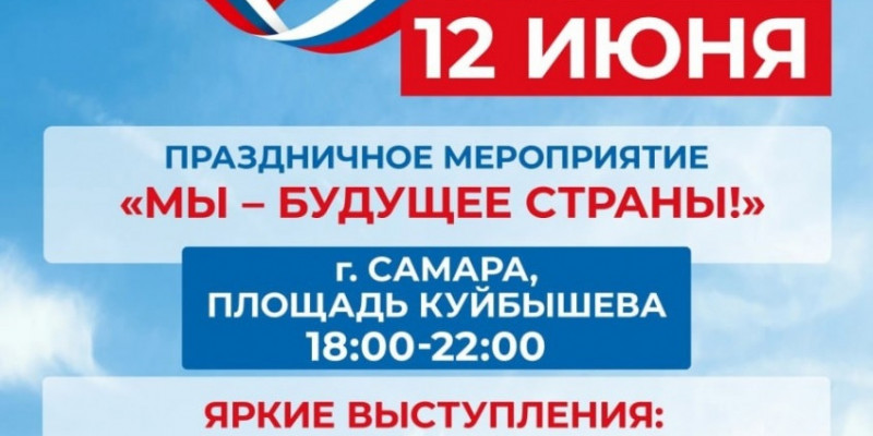 12 июня в честь праздника состоится большое праздничное мероприятие – на площади Куйбышева в Самаре выступят популярные коллективы Самарской области: молодёжные группы «Волны» и «Кинемо», хореографические коллективы «Новые лица» и «М5 шоу», группа «Утро» и многие другие. Кульминацией празднования станет выступление популярной российской рок-группы «Звери». Концерт начнется в 18.00 и завершится в 22.00.