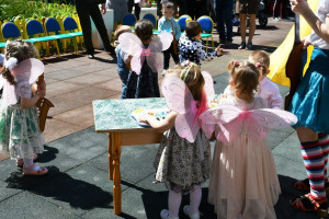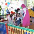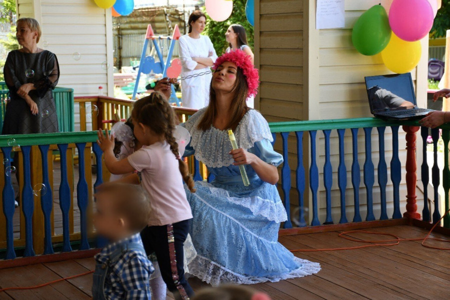 В творческой программе были танцы с цветами, песни, веселая музыка, игры. Праздничное настроение создавали сказочные персонажи Матрешка, Петрушка, Ириска, Солнышко, Клепа и Маша. Дети водили хоровод, играли на музыкальных инструментах, наперегонки собирали шарики.