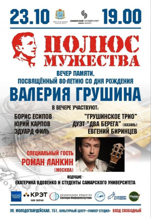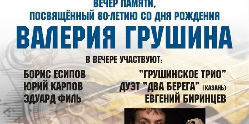 23 октября на площадке Универстудии на вечере памяти Валерия Грушина выступят исполнители авторской песни - Борис Есипов, Юрий Карпов, Эдуард Филь, «Грушинское трио», дуэт «Два берега» (Казань), Евгений Биринцев и клуб «Вольный ветер».
