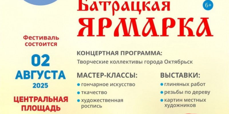 2 августа 2025 года в КДК Октябрьский состоится Межмуниципальный фестиваль народного творчества и ремесел «Батрацкая ярмарка». 6+