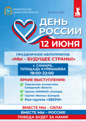 12 июня в честь праздника состоится большое праздничное мероприятие – на площади Куйбышева в Самаре выступят популярные коллективы Самарской области: молодёжные группы «Волны» и «Кинемо», хореографические коллективы «Новые лица» и «М5 шоу», группа «Утро» и многие другие. Кульминацией празднования станет выступление популярной российской рок-группы «Звери». Концерт начнется в 18.00 и завершится в 22.00.