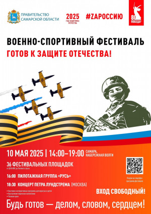 Военно-спортивный фестиваль «Готов к защите Отечества» проходит в Самаре 10 мая на набережной реки Волга от памятника Григорию Засекину до бассейна ЦСКА ВВС. Он является продолжением празднования 80-летия Великой Победы. Фестиваль посвящён Году Защитника Отчества, который объявлен Президентом России Владимиром Путиным. (0+)