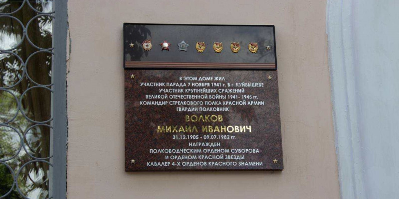 В Самаре открыли мемориальную доску участнику Великой Отечественной войны, гвардии полковнику Михаилу Ивановичу Волкову. С просьбой увековечить память деда его внук обратился к губернатору Самарской области Вячеславу Федорищеву. Памятный знак установила администрация Ленинского района на доме №117 по улице Ленинской: именно здесь ветеран прожил 29 лет – с 1953 до смерти.