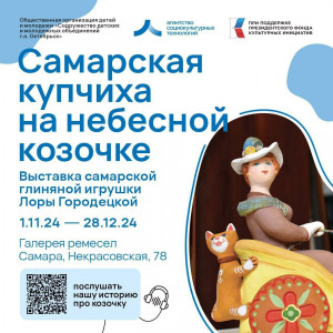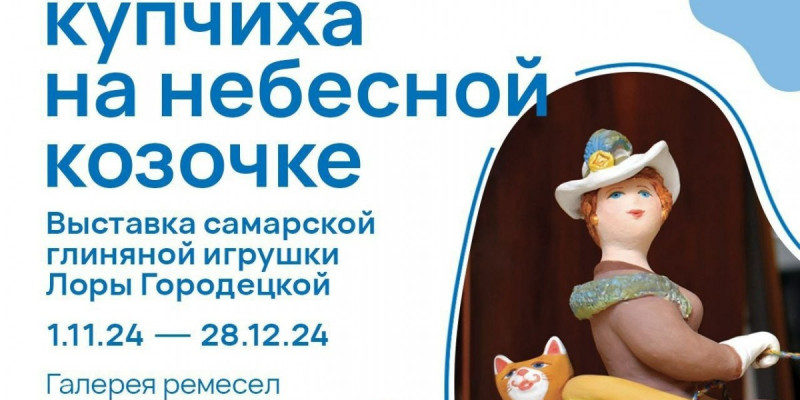 Открывает галерею выставка самарской глиняной игрушки заслуженного работника культуры РСФСР, мастера народных художественных промыслов и ремесел, декоративно-прикладного искусства Самарской области Лоры Городецкой – «Самарская купчиха на небесной козочке». На выставке ее игрушки буквально оживают: пьют чай с баранками, ведут степенные разговоры, прогуливаться в цветочном саду, летают на Луну , и все это благодаря самарскому писателю Денису Либстеру, который специально для выставки написал литературные истории. Сказочные новеллы можно будет не только прочитать, но и послушать. Актер и режиссер театра САМАРТ Алексей Елхимов записал аудиоспектакль по мотивам сказок из волшебной страны Лоры Городецкой.