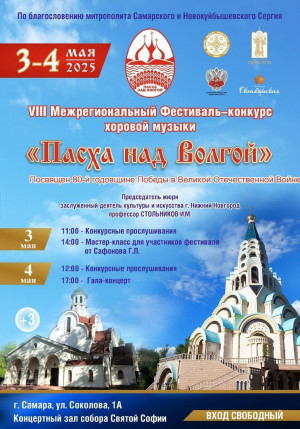 3 и 4 мая в Самаре пройдет VIII Межрегиональный фестиваль-конкурс хоровой музыки «Пасха над Волгой», посвященный 80-й годовщине Победы в Великой Отечественной войне. Он пройдет в концертном зале собора Софии Премудрости Божией (ул. Соколова, 1А) и будет организован Самарской епархией. (0+)