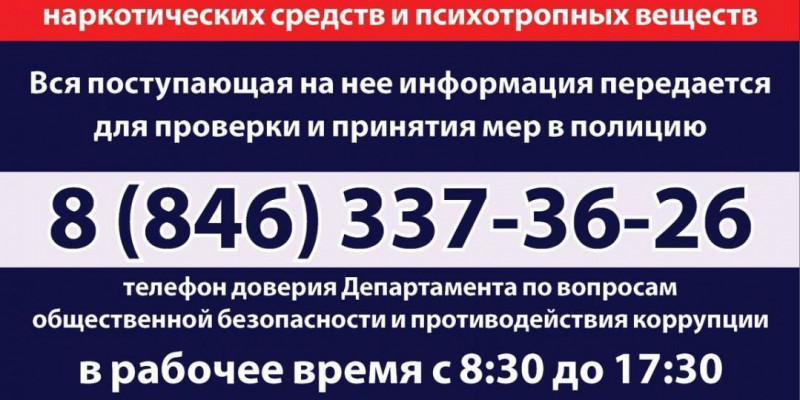 В Самаре работает «горячая линия» по вопросам незаконного распространения наркотических средств и психотропных веществ. Вся поступающая на нее информация передается для проверки и принятия мер в полицию. Звонки принимаются по следующим номерам: 8(846)337-36-26 - телефон доверия Департамента по вопросам общественной безопасности и противодействия коррупции, в рабочее время с 8:30 до 17:30; 8(846) 278-13-40 - круглосуточный телефон доверия ГУМВД России по Самарской области.