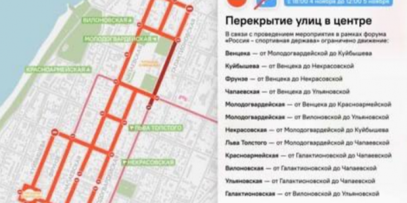 С 06:00 до 12:00 5 ноября недоступными для проезда будут участки следующих улиц: