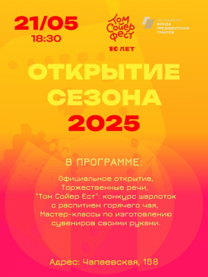 В среду, 21 мая в 18:30, в Самаре состоится торжественное открытие одиннадцатого сезона фестиваля «Том Сойер Фест». Гостям расскажут о планируемых мероприятиях, о совместном проекте с Третьяковской галереей и самарскими художниками, а также о планах по созданию мурала. Гостей ждут в «Саду наличников» на ул. Чапаевской, 168.