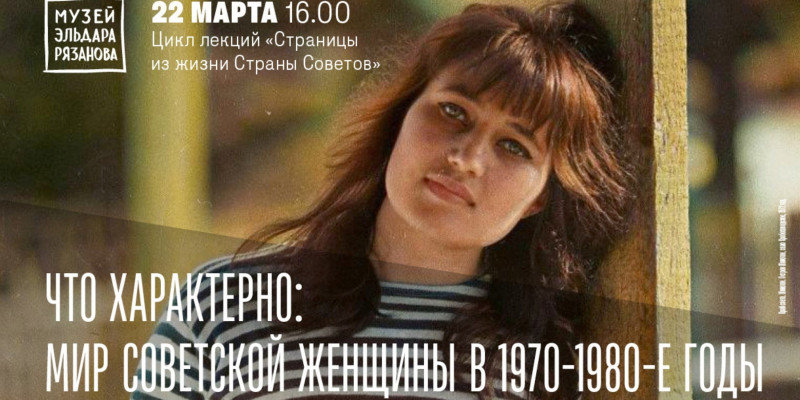 22 марта (суббота) в 16.00 в Музее Эльдара Рязанова пройдет первая встреча цикла лекций «Страницы из жизни Страны Советов» (12+). Историк, старший научный сотрудник музея Ирина Янцен прочитает лекцию «Что характерно: мир советской женщины в 1970–1980-е годы» (12+).