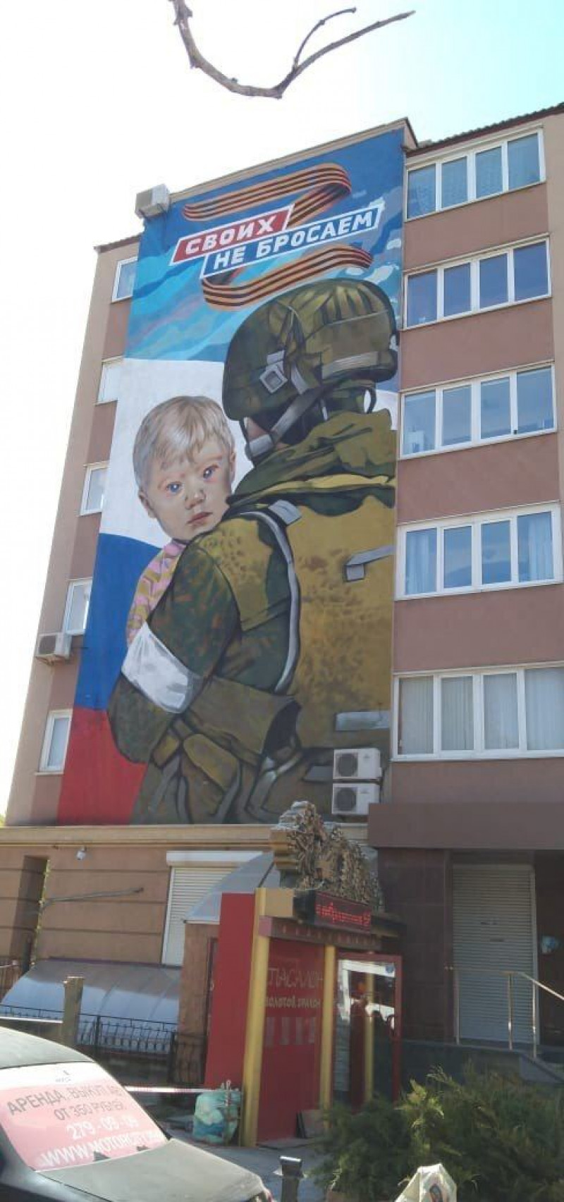 На общем тематическом мурале, который открылся в областной столице на улице Самарской, изображен российский триколор, а в основе композиции – солдат, держащий на руках ребенка. Собирательный образ солдата с ребенком на руках олицетворяет идею ценности мирной жизни, а дети – ее цветы, которые могут быть варварски сорваны и растоптаны идеологией неонацизма.