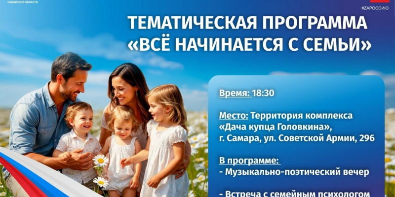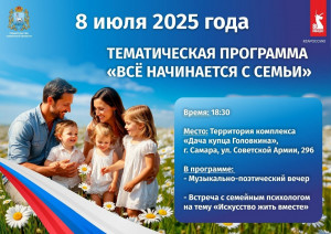 В столице региона основные праздничные мероприятия пройдут 8 июля на территории комплекса «Дача купца Головкина» («Дом со слонами»). В День семьи, любви и верности здесь проведут торжественные церемонии бракосочетания. В 11.00 состоится вручение наград «За любовь и верность» супружеским парам из Самары. С 19.00 до 21.00 гостей ждет тематическая программа «Все начинается с семьи», принять участие в которой смогут все желающие, в том числе пары, подавшие заявление о заключении брака в органы ЗАГС региона. В программе: лекция психолога «Искусство жить вместе» для молодых семей, музыкально-поэтическая программа с участием самарских артистов.