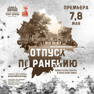 7 мая в 18:30, 8 мая в 18:00, 31 мая в 18:00 на большой сцене Самарской драмы будет представлена повесть для театра в двух действиях Вячеслава Кондратьева «ОТПУСК ПО РАНЕНИЮ» (16+).
