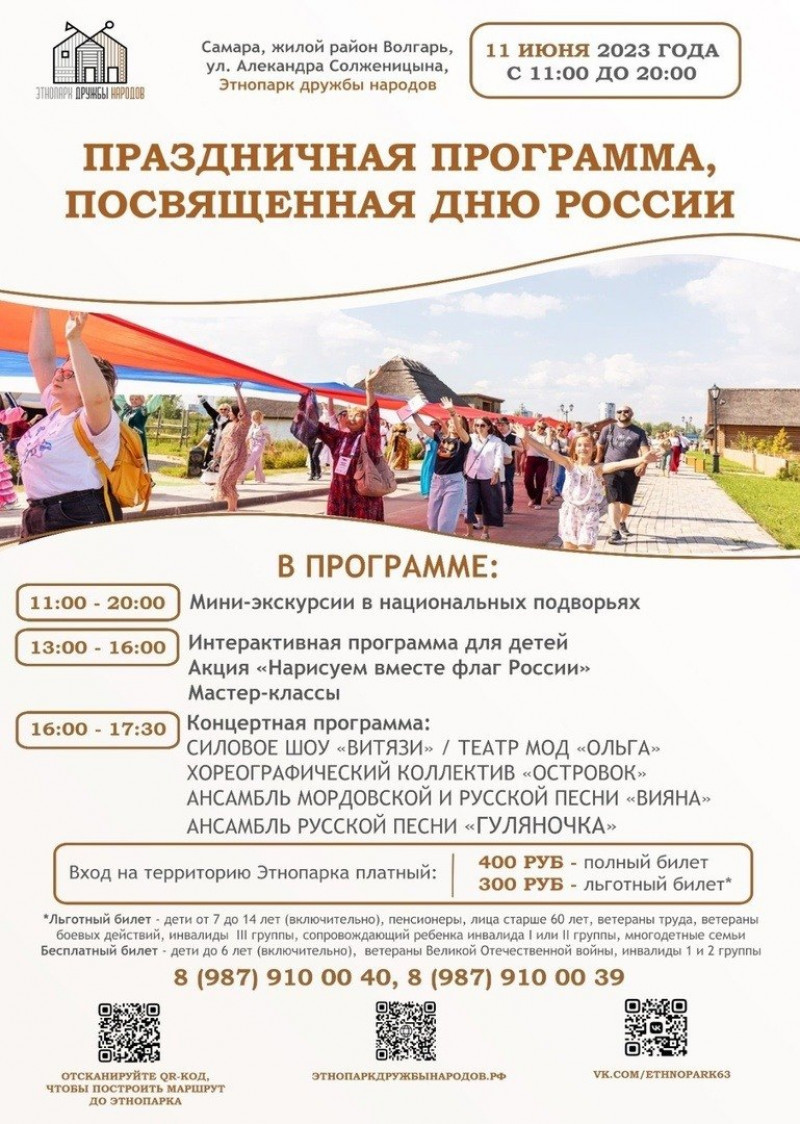 11 июня 2023 года для посетителей Этнопарка дружбы народов, расположенного на улице А. Солженицына в Куйбышевском внутригородском районе, готовят тематическую программу, посвященную государственному празднику – Дню России, который ежегодно отмечается 12 июня.