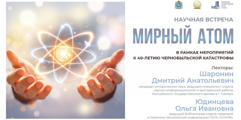 На встрече «Мирный атом» выступят ведущий специалист отдела научно-информационной и выставочной работы Российского государственного архива в г. Самаре, кандидат исторических наук Дмитрий Анатольевич Шаронин и ведущий библиограф отдела правовой и патентно-технической информации ГБУК «СОУНБ» Ольга Ивановна Юдинцева. Они познакомят слушателей с историей, современным состоянием и перспективами развития атомной отрасли России и продемонстрируют уникальность российских атомных технологий.