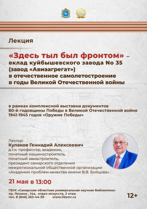 21 мая в 13:00 Самарская областная универсальная научная библиотека приглашает жителей города на открытую лекцию «Здесь тыл был фронтом» о вкладе куйбышевского завода № 35 (завод «Авиаагрегат») в отечественное самолётостроение в годы Великой Отечественной войны.