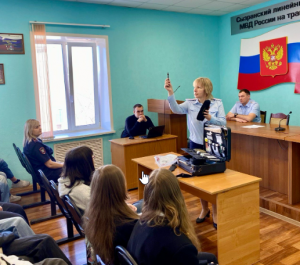 Заместитель командира роты отдельной роты ППСП майор полиции Вера Мамонова рассказала о роли советской милиции в военные годы. Привела примеры судеб героев-милиционеров, кто защищал Родину от фашизма. Также познакомила ребят с историей Сызранского линейного отдела, рассказала об основных направлениях деятельности транспортных полицейских.