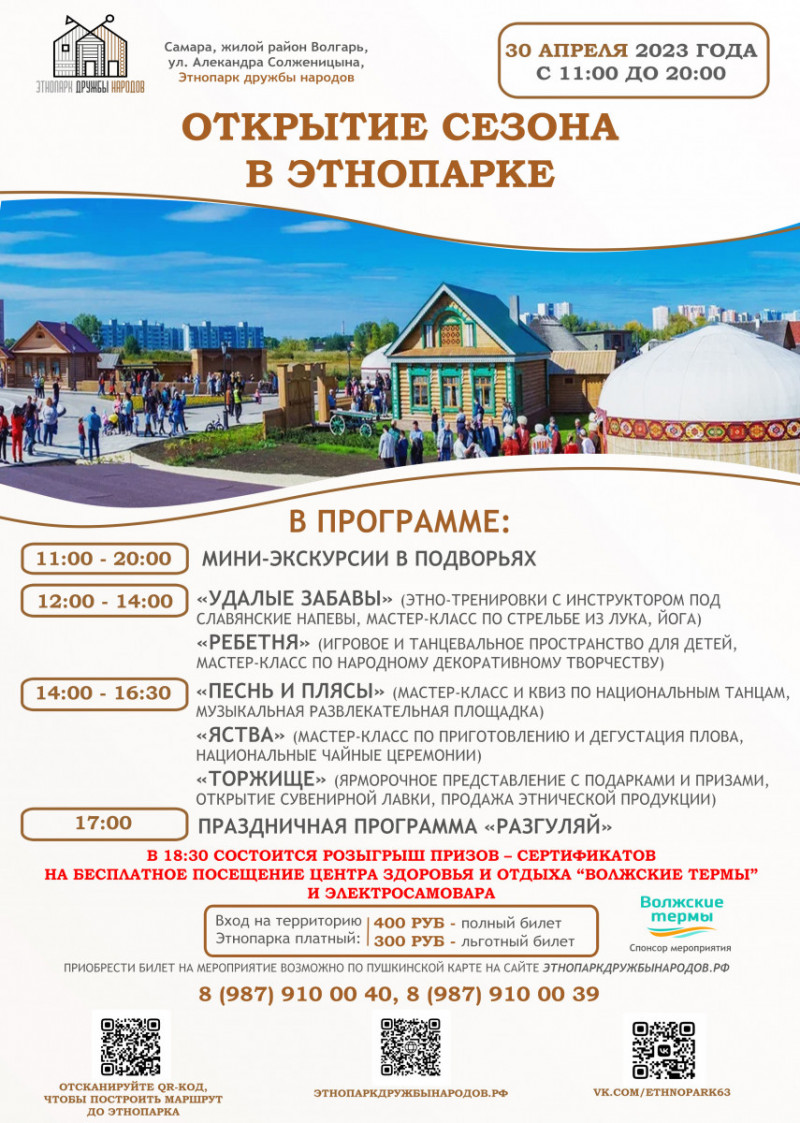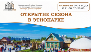 30 апреля 2023 года с 11:00 до 20:00 на территории Этнопарка дружбы народов, находящемся на улице Александра Солженицына в Куйбышевском внутригородском районе Самары, пройдет мероприятие, посвященное открытию весенне-летнего сезона – 2023.