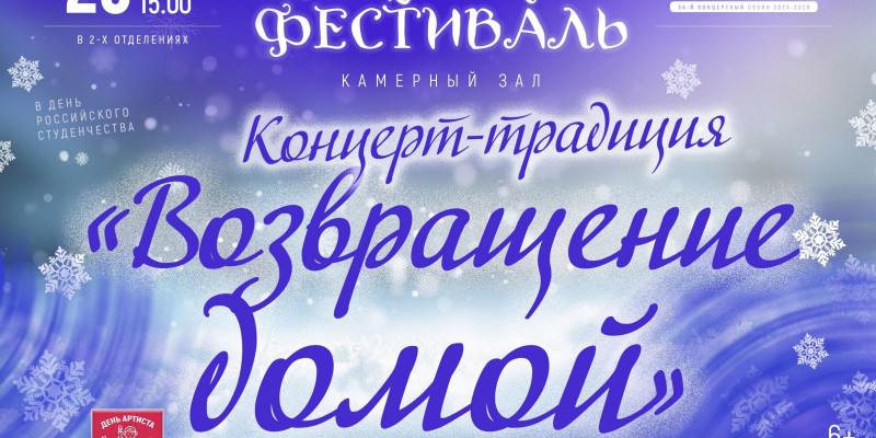 Завершающий концерт VI Крещенского фестиваля «Возвращение домой» в Тольяттинской филармонии — удивительно атмосферный, полный встреч с друзьями и учителями праздник молодых профессионалов, выпускников и студентов ведущих музыкальных вузов России. Все семнадцать участников большого воскресного концерта 25 января выросли в Тольятти и возвращаются на зимние каникулы, чтобы подарить землякам свое мастерство. На сцене камерного зала в этот день будут творить молодые музыканты. А программа от Моцарта и Бетховена до Прокофьева и современных аранжировок продемонстрирует блестящий уровень академической школы. (6+)