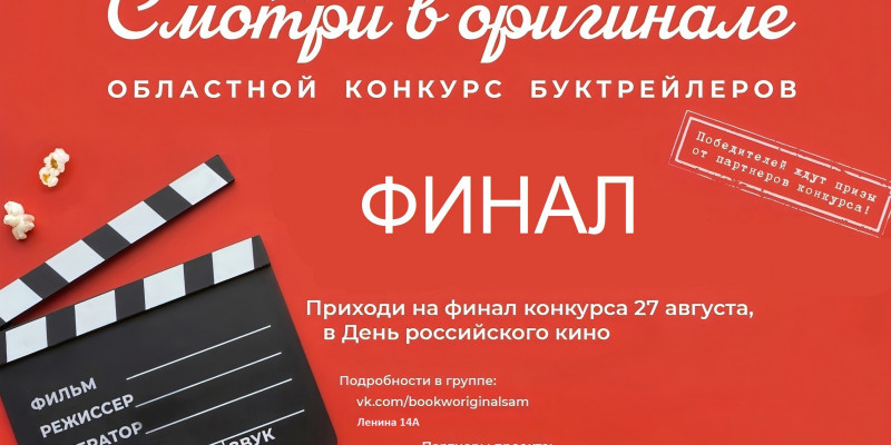 В День российского кино, 27 августа, в Самарской областной универсальной научной библиотеке пройдёт финал областного конкурса буктрейлеров «Смотри в оригинале». Жители Самары смогут не только узнать имена авторов лучших видеоработ, но и одними из первых увидеть представленные на суд жюри и зрителей буктрейлеры к произведениям Александра Пушкина, Антона Чехова, Анны Ахматовой, Льюиса Кэрролла, Джоан К. Роулинг, Джона Бойна и многих других знаменитых писателей.