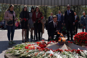 У Вечного огня губернатор вручил государственные награды Российской Федерации вдовам погибших военнослужащих. Вместе они возложили цветы к Вечному огню и скульптурной композиции «Ожидание солдата».