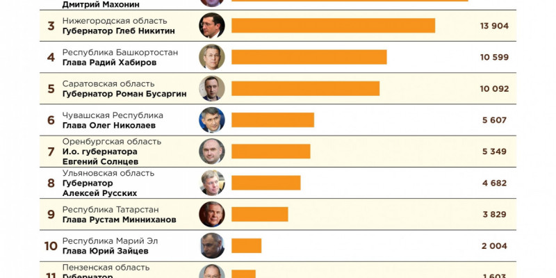 На 7-м месте губернатор Самарской области Вячеслав Федорищев (16 277). В марте в приволжском регионе также не обошлось без атак БПЛА – была попытка нанесения ущерба промышленному предприятию в Сызрани, дрон был ликвидирован; три БПЛА были сбиты в Новокуйбышевске. Заметным стал визит в Самарскую область главы Минстроя Файзуллина, который подчеркнул важность завершения строительства станции метро «Театральная» в Самаре. Важным событием стал визит в регион делегации из Мьянмы во главе с премьер-министром Мин Аун Хлайном, который в сопровождении Федорищева и главы «Роскосмоса» Баканова познакомился с работой производственных площадок АО «РКЦ Прогресс». Однако наиболее резонансным стало заявление Федорищева по поводу создания «открытого реестра инициатив и обещаний правительства Самарской области», в котором «будет отражено все, что было обещано и анонсировано чиновниками, руководителями различного уровня». Жители региона с воодушевлением и живо встретили очередную оригинальную инициативу губернатора, и уже вовсю каламбурят в Telegram-каналах, что «ждут выполнение обещания губернатора о появлении реестра обещаний».