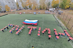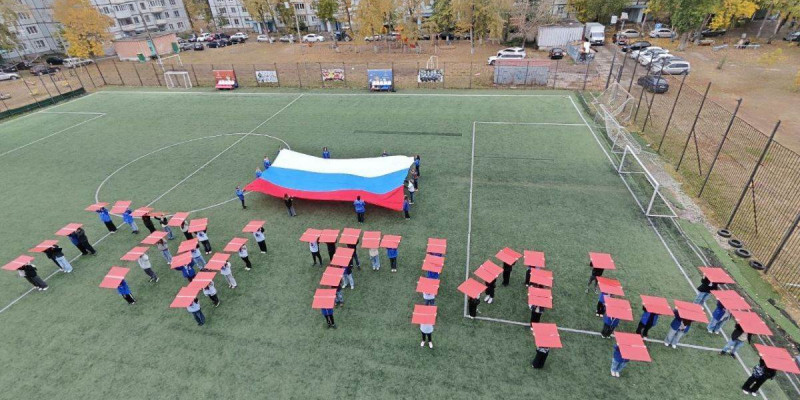 Молодые жители региона развернули 60 квадратных метров российского триколора и выстроились в надпись «ПУТИН».