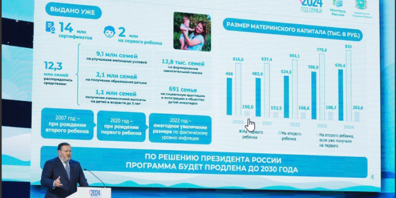 Министр напомнил, что по решению Президента программа материнского капитала продлена до 2030 года, а начиная с 2023 года материнский капитал ежегодно индексируется на уровень фактической инфляции предыдущего финансового года. Также упрощается процедура его получения. До 2030 года продлена программа субсидирования 450 тысяч рублей по ипотечным программам для семей, в которых рождается третий ребенок. Работают меры поддержки семей с невысоким уровнем дохода, многодетных семей, работающих родителей.