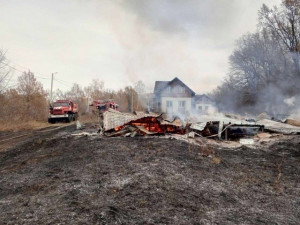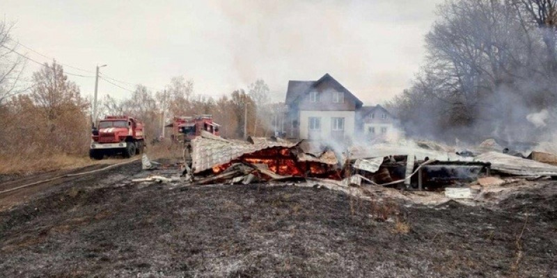 По прибытии на место пожара было установлено, что горят одноэтажный деревянный дом на площади 120 квадратных метров, 0,025 га территории, покрытой лесом, и 0,053 га сухой травы.