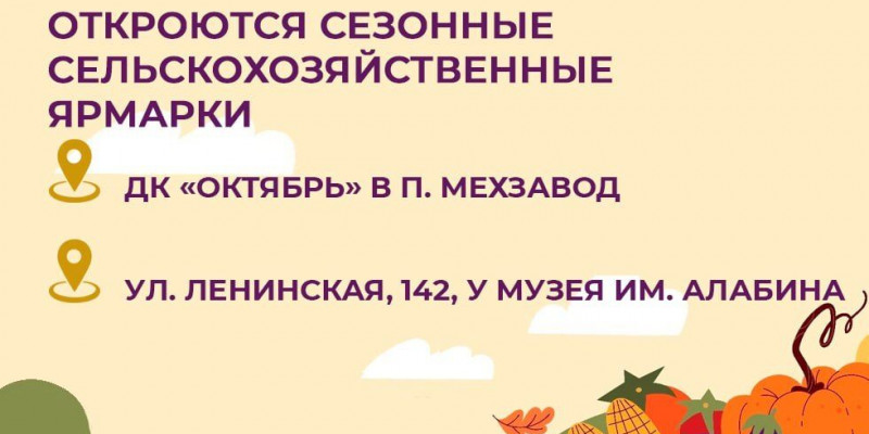 Ярмарки разместятся около ДК «Октябрь в поселке Мехзавод» и на ул. Ленинская, 142, у музея им. П.В. Алабина.