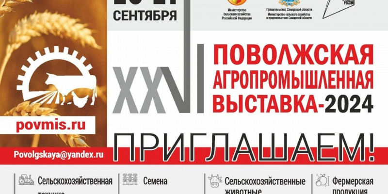В Самарской области 20 и 21 сентября 2024 года пройдет XXVI Поволжская агропромышленная выставка – 2024.