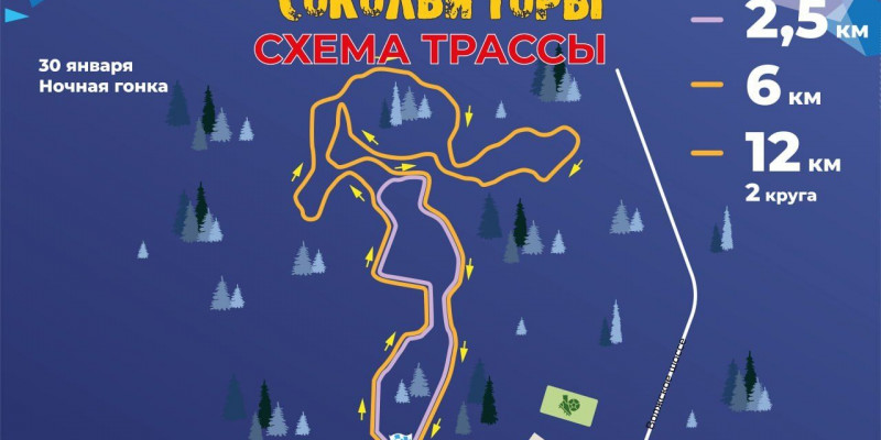 - 30 января – ночная гонка, свободный стиль, масс-старт на дистанциях: 2,5 км бесплатный забег, 6 км, 12 км;